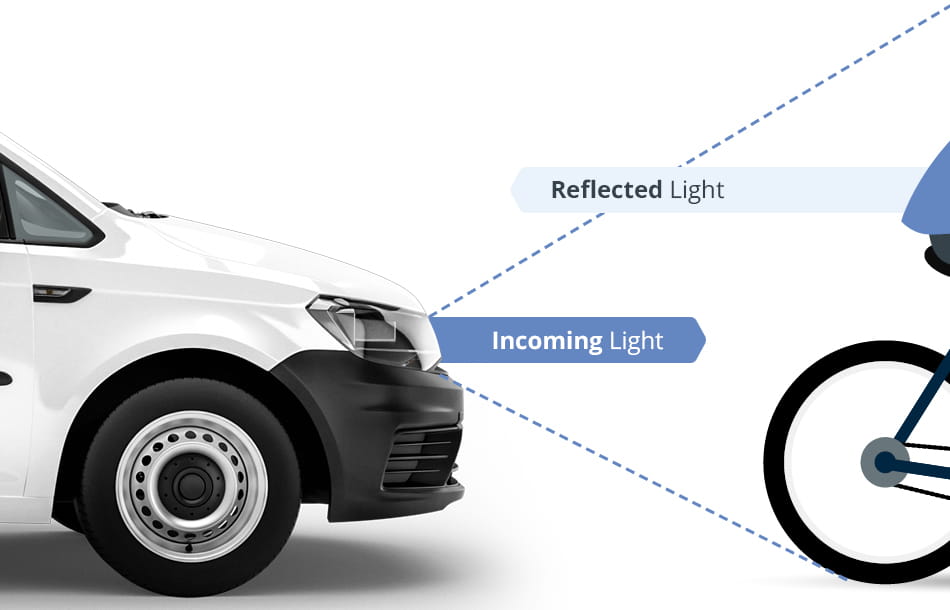 Retroreflection occurs when light rays are reflected back in the direction from which they came. They therefore send the light back to the irradiating light source. Imagine a bicycle at the side of the road. A vehicle is driving towards it with its headlights on. If this bicycle is equipped with spoke reflectors or the rider is wearing clothing made of retroreflective material (high-visibility waistcoat), a large amount of the reflected light will be reflected back towards the original light source, e.g. the vehicle headlights. This improves the recognition of the bike or person by the driver and thus also increases the possible reaction time for the driver so that a dangerous situation does not arise.